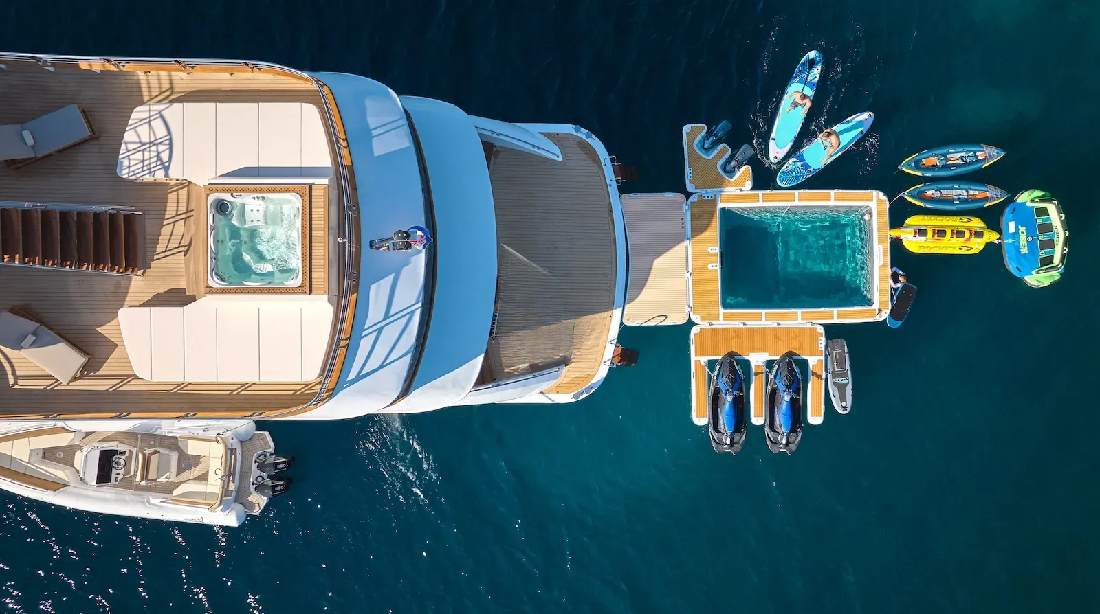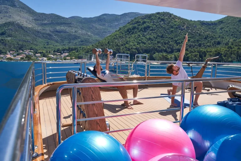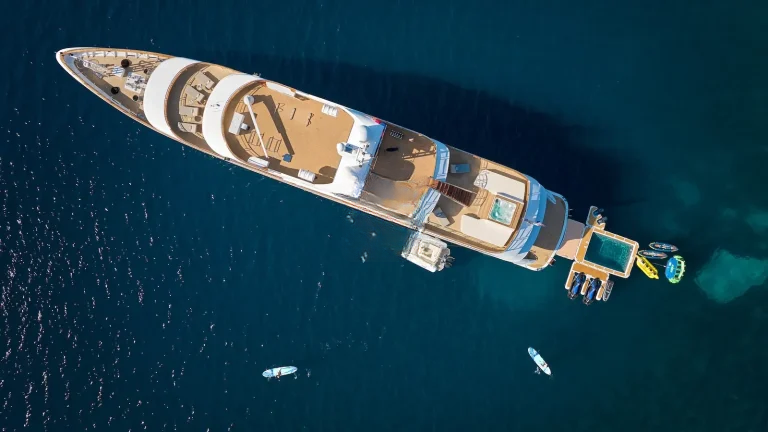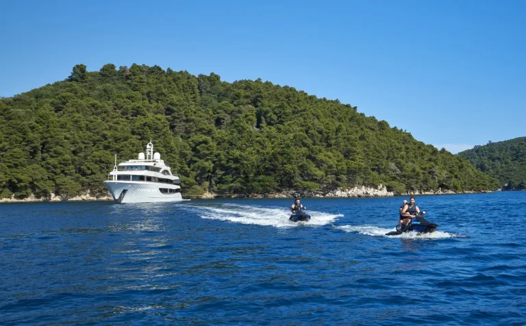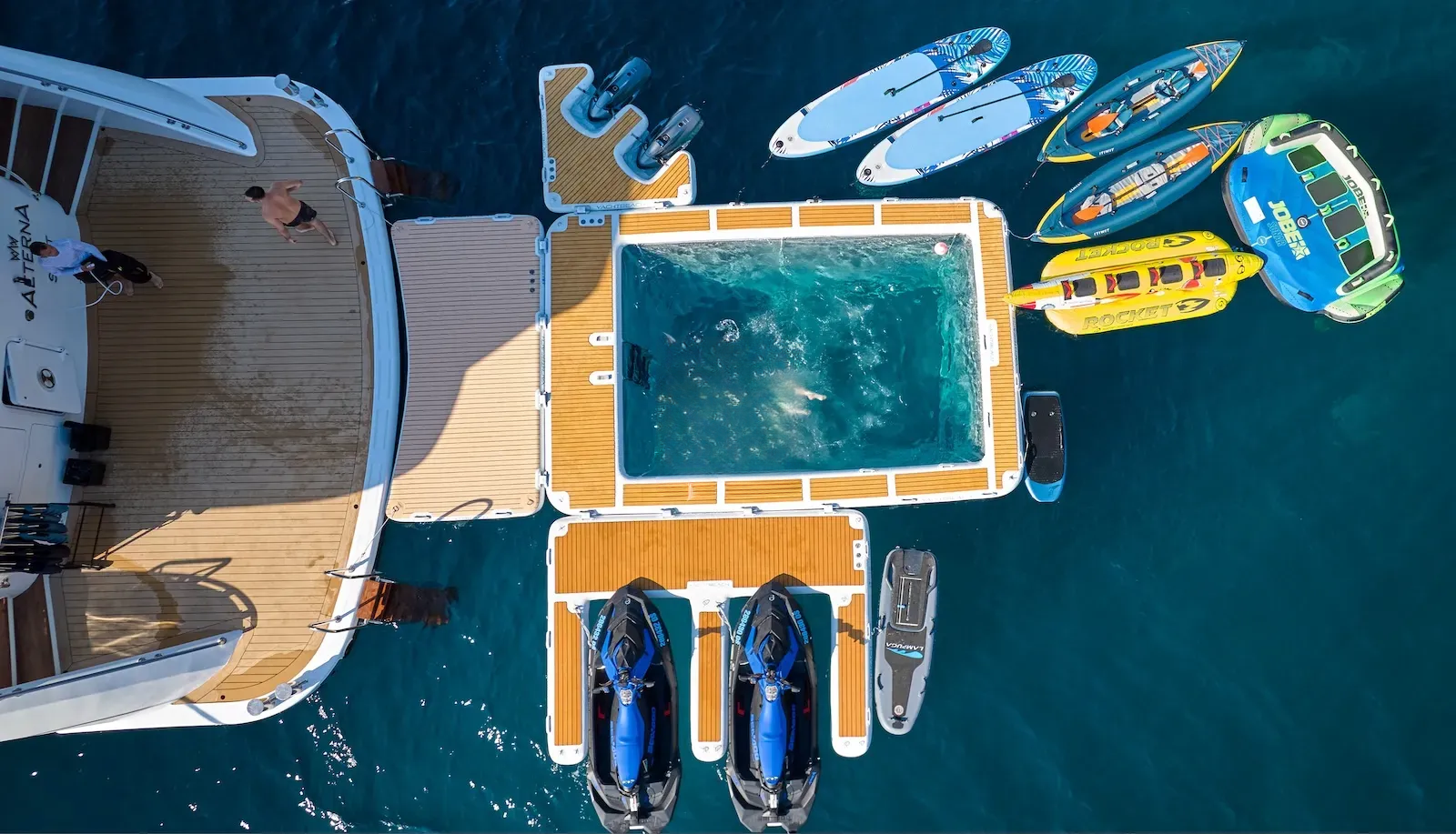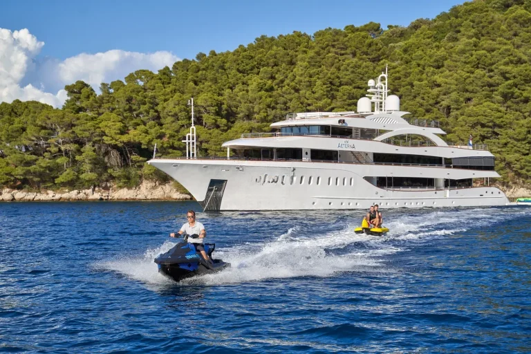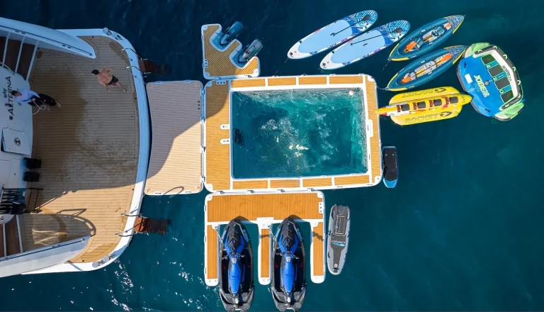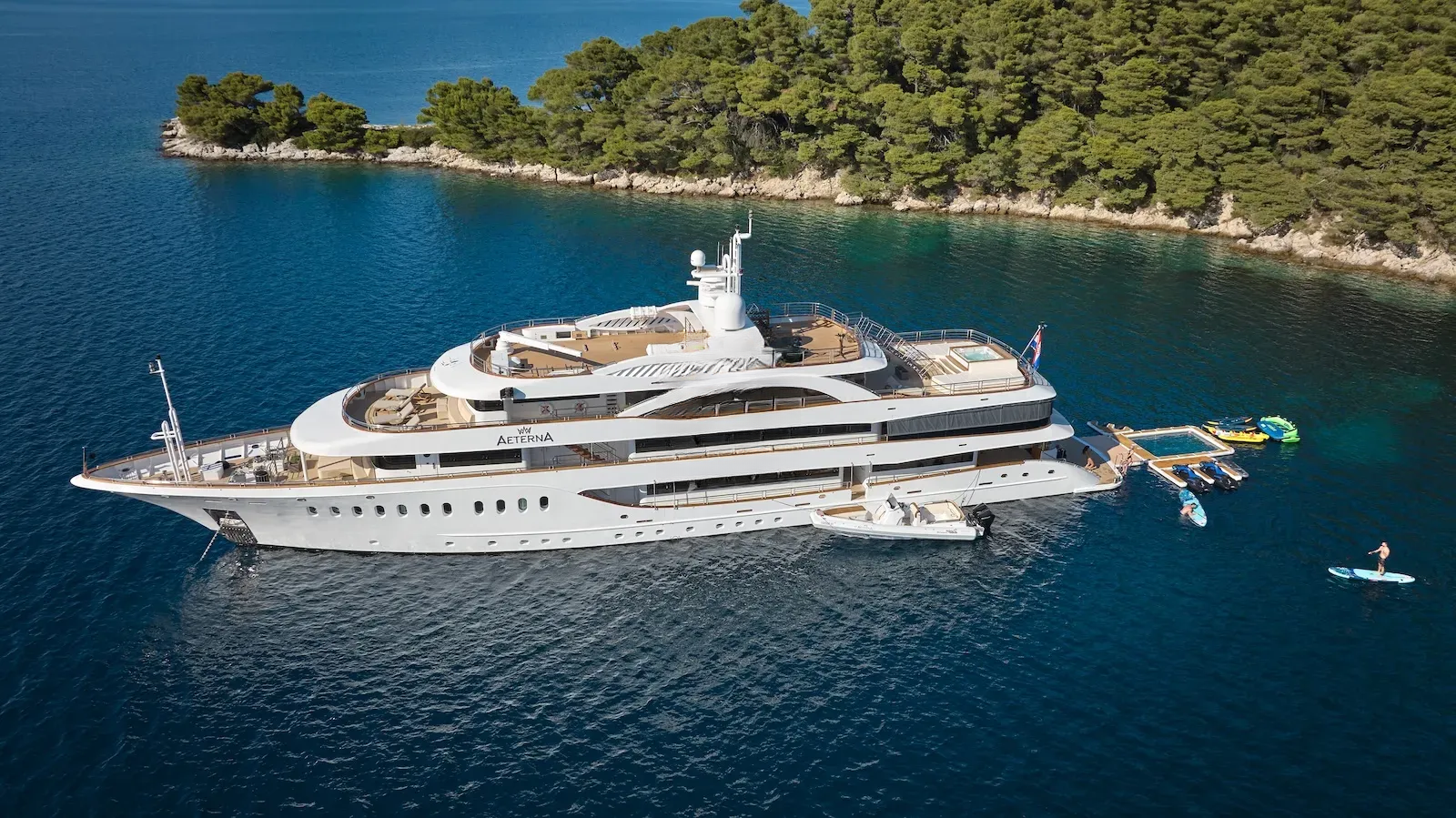 For those who are more active, there is a large outdoor gym on the top deck featuring a treadmill and exercise bike along with a TRX, pull-up bar, free weights and yoga mats. There is an 8.7m Marine Mito chase boat as well as a 5m Brig tender, that allows guests to fully explore the stunning surroundings or try out water sports. AETERNA has an extensive selection of water toys, from Seadoo jetskis, Seabobs and waterskis, to a choice of towables for those who just want to have fun. There is an extendable swim platform and an inflatable netted sea pool, which creates a safe and secure swim area for guests. Anyone preferring a slower pace will be able to take advantage of the fishing equipment, lie back on the floating mattresses, or go off on a paddleboard to explore the local coastlines.