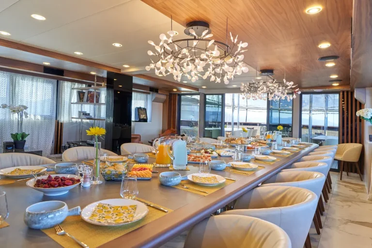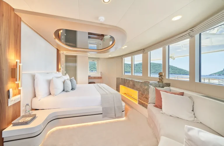 Her quality artisan furnishings and attention to detail within its design, combine to create an intimate feel that belies the size of it’s spacious interior. She presents with 4 x beautifully appointed master staterooms, each individually furnished to a high specification and all with his and hers en suites. On the lower deck she has a further 4 x convertible double staterooms, each with king size beds that can also be presented as twins, plus 2 x twin staterooms, all enjoying en suite and Smart TVs, including satellite TV. The design of all staterooms focuses on delivering the ultimate in comfort and luxury for her guests, ensuring a good nights sleep wherever you are.