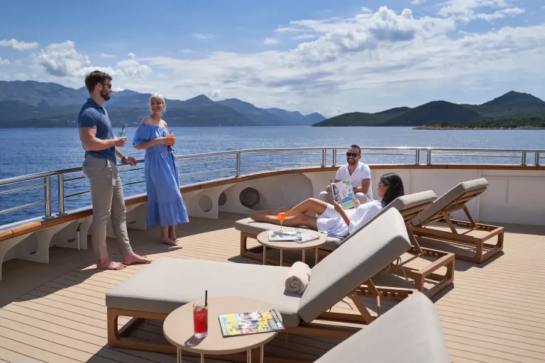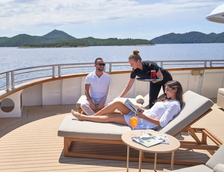 Her impressive main saloon has two dining tables, able to host 24 guests at a sitting, with an adjoining informal lounge area where guests can relax with a pre-dinner drink from the bar. If guests wish to dine outside and enjoy the beautiful surroundings, there are two dining tables on the upper deck, also seating 24 guests. The sundeck is the perfect space for entertaining guests, whether sunbathing, resting beside the Jacuzzi or lounging by the bar area. For those who prefer an informal setting it boasts its own BBQ area, earthen pizza oven, and even an outdoor cinema, making it the perfect spot to sit back and enjoy the onboard entertainment.