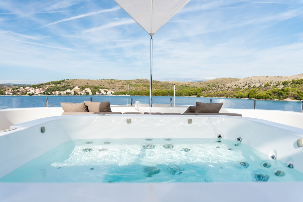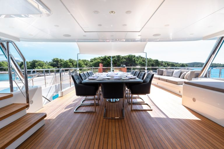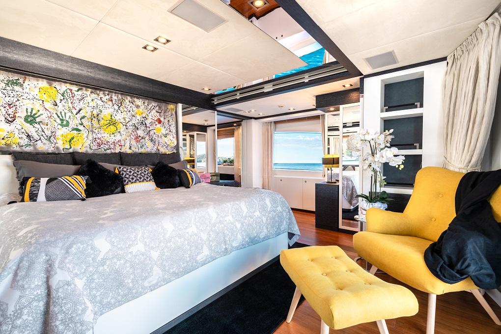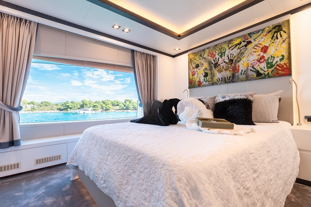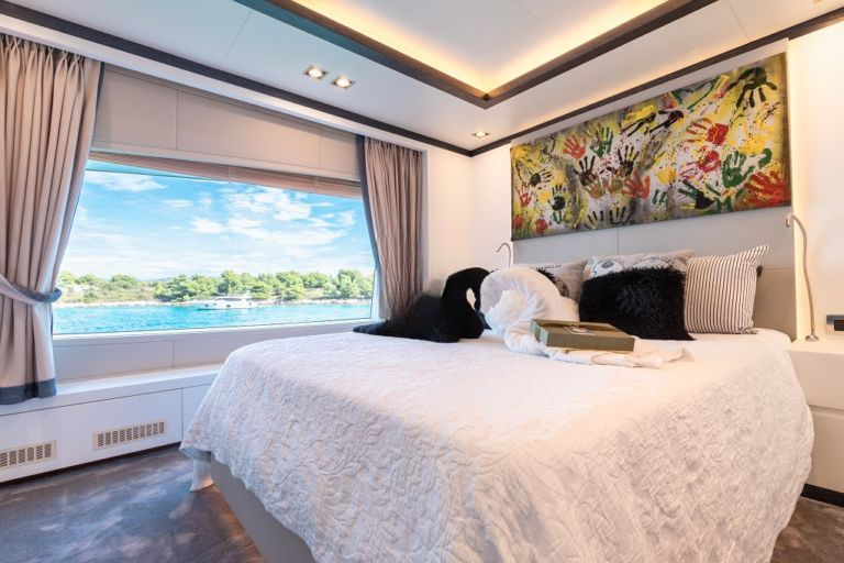 Her interior is designed by Francois Zuretti. The Master and VIP are in prime position, with the VIP on the upper deck and the huge Master on the Main deck. 2 doubles and 2 twins are positioned on the lower deck. The full-beam Master Cabin located forward on the Main deck