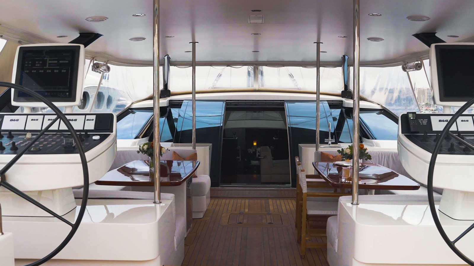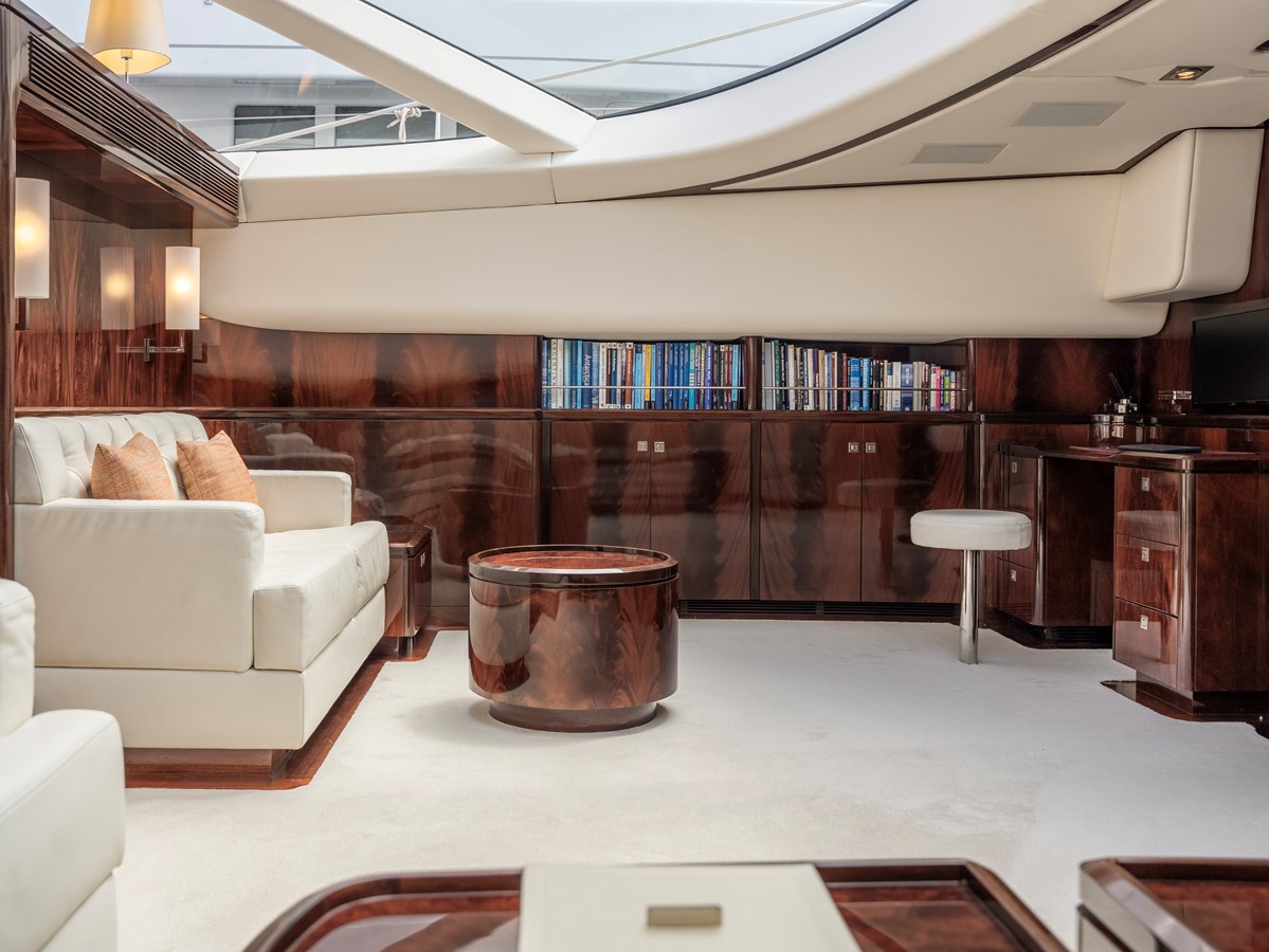 On deck, the yacht is optimized for outdoor living. The aft cockpit is sheltered for al fresco dining, while expansive lounging areas amidships and forward provide options for sunbathing or relaxing in the shade under the retractable forward canopy.