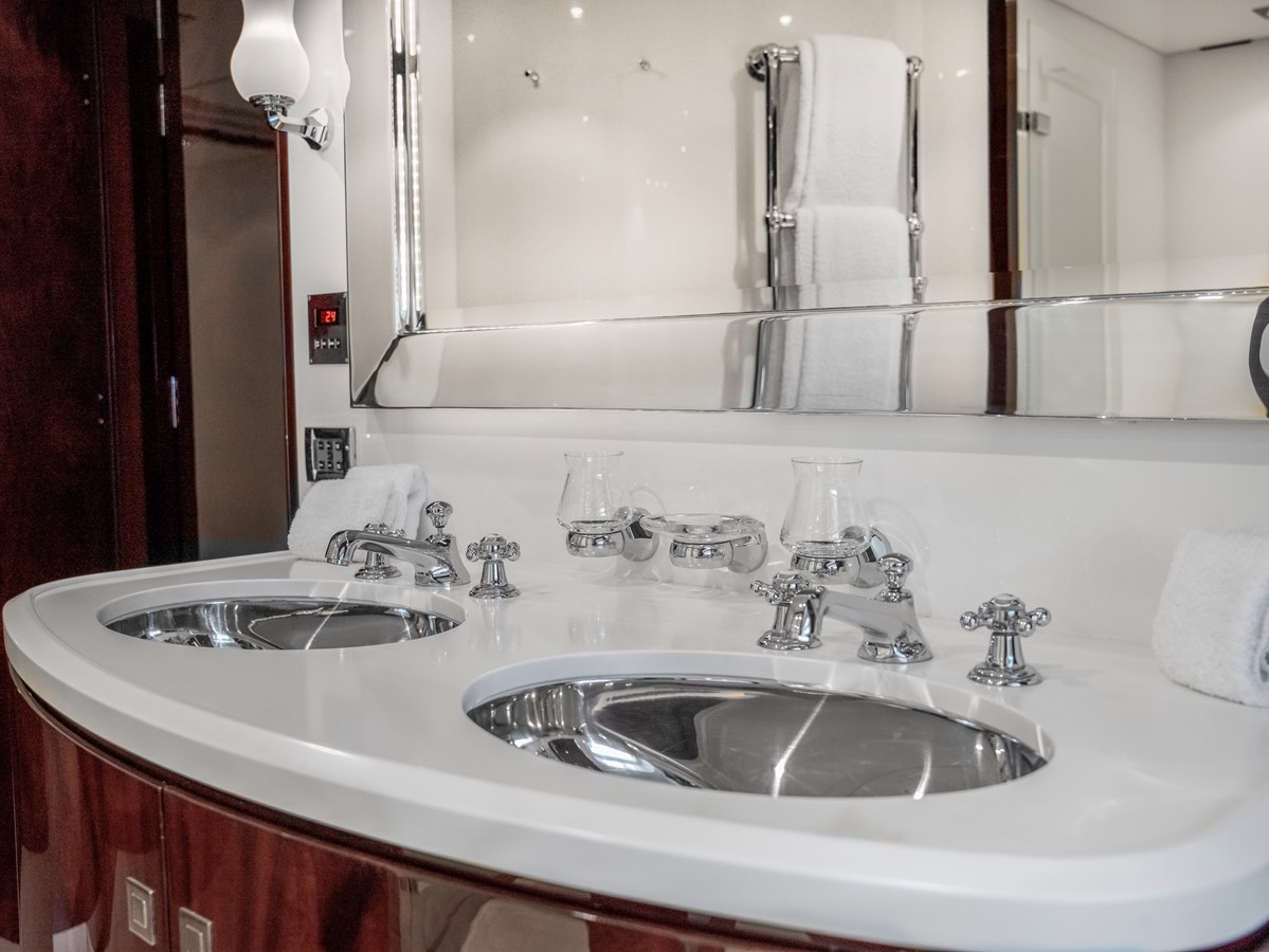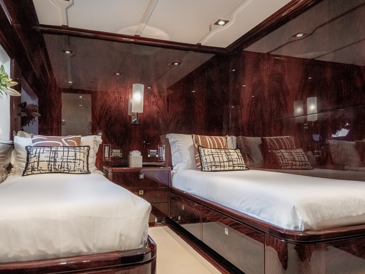 Accommodation is configured across four ensuite cabins: a full-beam master suite, two double staterooms, and one twin cabin—each appointed with premium fixtures and finishes to ensure guest comfort and privacy.